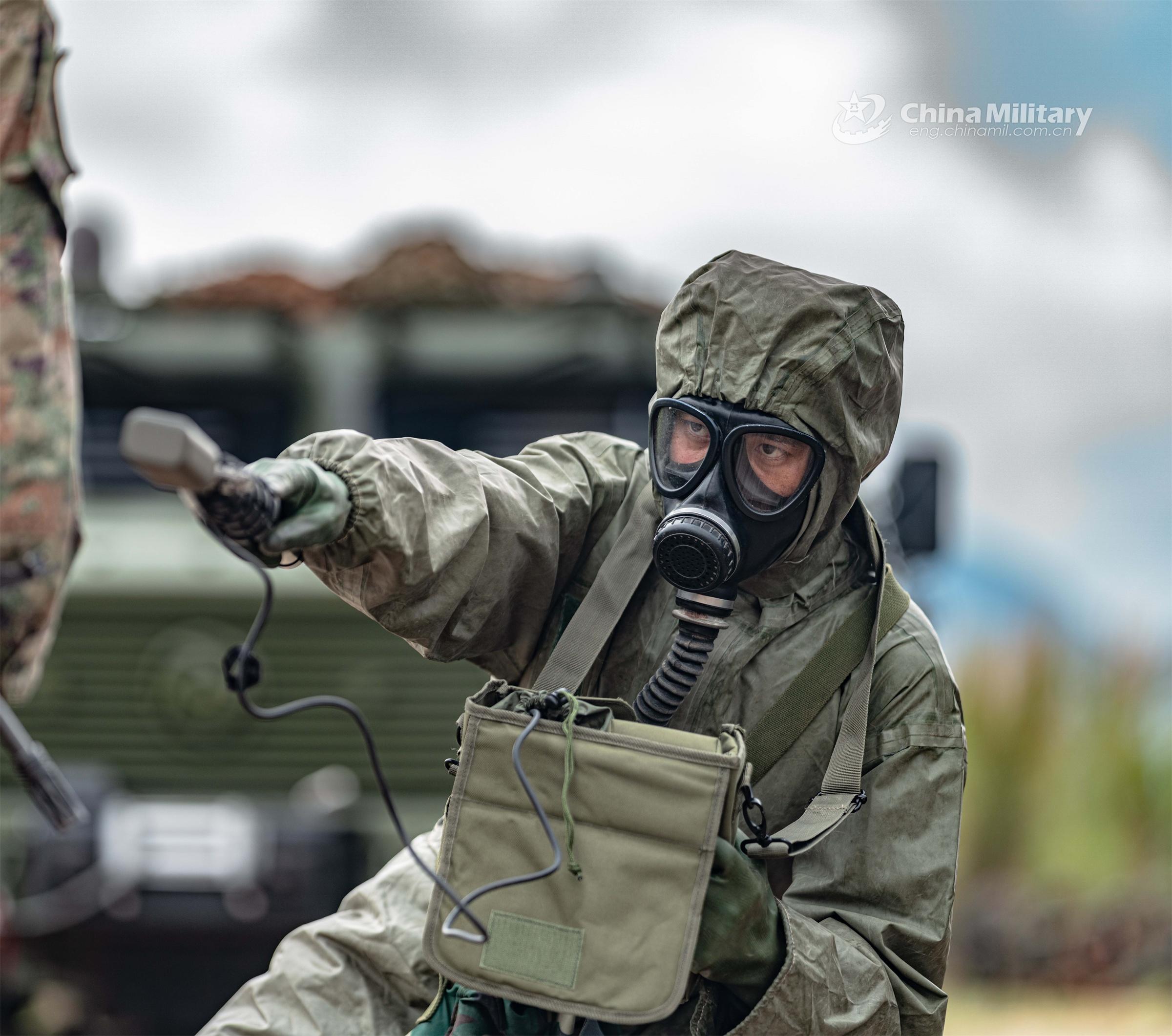 A soldier assigned to a chemical defense element of a brigade under the PLA 75th Group Army tests the contamination status of another soldier during a comprehensive chemical training exercise on July 12, 2023. (eng.chinamil.com.cn/Photo by Teng Zhaoseng)