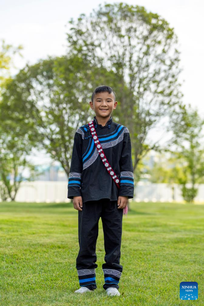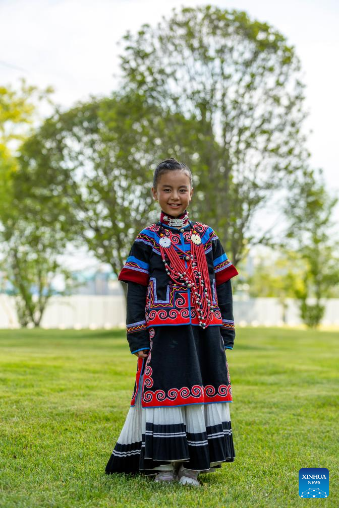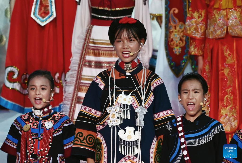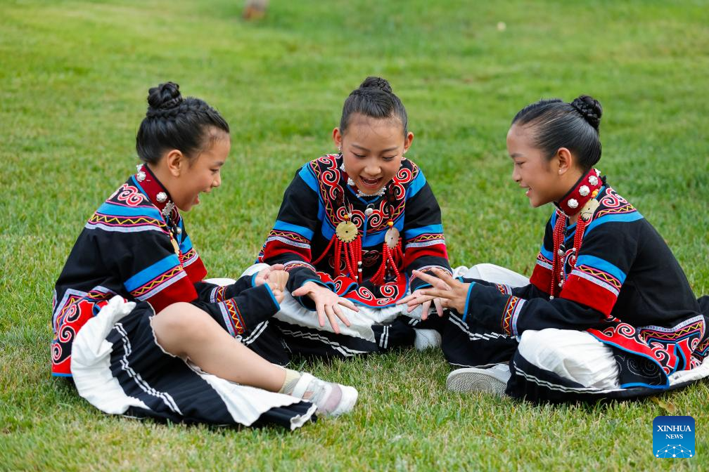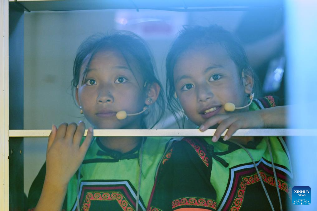 Jiduoshila (C) performs during a rehearsal of the opening ceremony in Zhaojue County of southwest China's Sichuan Province, July 2, 2023. Six children dressed in traditional Yi ethnic costumes choired a song to inaugurate the opening ceremony of the 31st summer edition of the FISU World University Games. (Xinhua)