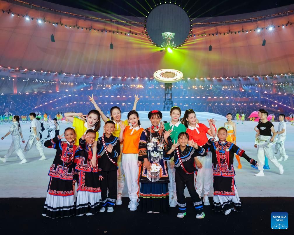 Children from Zhaojue County, Liangshan Yi Autonomous Prefecture pose with other performers after participating in a rehearsal of the opening ceremony in Chengdu of southwest China's Sichuan Province, on July 23, 2023. (Xinhua/Shen Bohan)