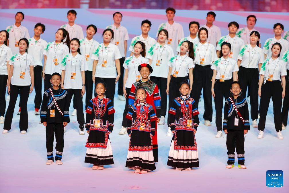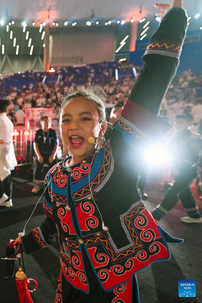 Children (front) from Zhaojue County, Liangshan Yi Autonomous Prefecture participate in the opening ceremony in Chengdu of southwest China's Sichuan Province, on July 28, 2023. (Xinhua/Wu Gang)