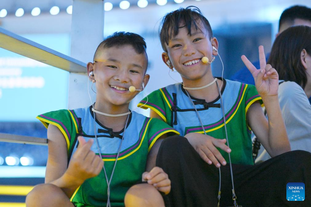 Jiziyisheng, Edirehan, Ma Jieying, Jihaoyouguo, Jihelazuo, Jiduoshila (L to R, front) perform during a rehearsal of the opening ceremony in Chengdu of southwest China's Sichuan Province, July 8, 2023. (Xinhua/Shen Bohan)