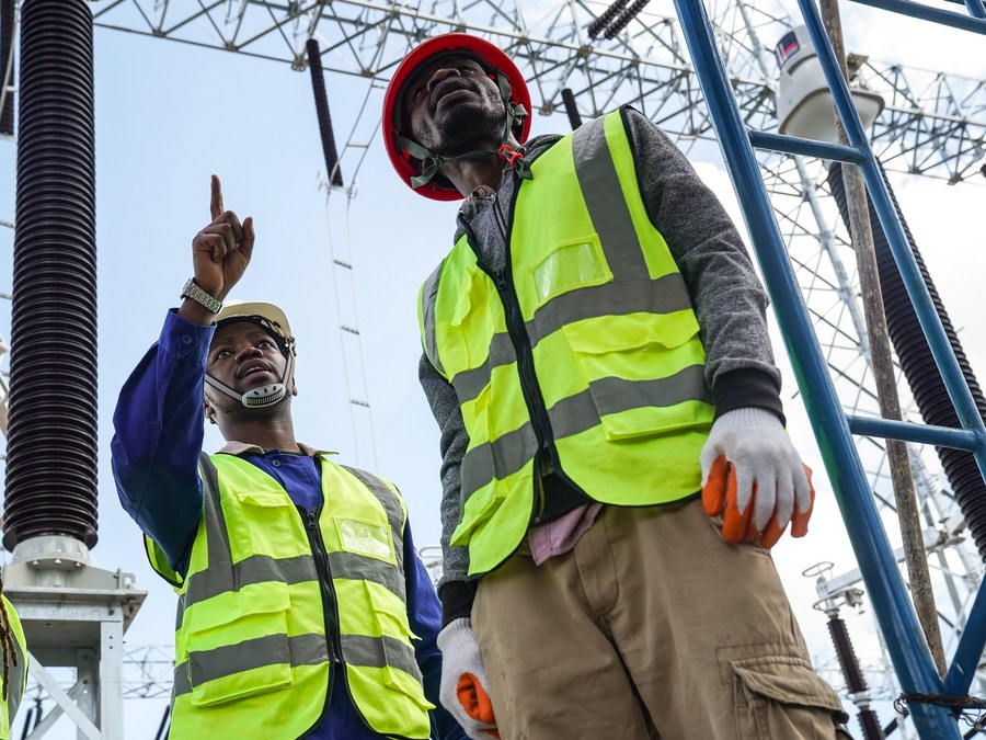David Maina Kamore (L) discusses with his colleagues on the transformer installation at the construction site of Konza transformer substation in Machakos County, Kenya, May 5, 2023. (Xinhua/Han Xu)