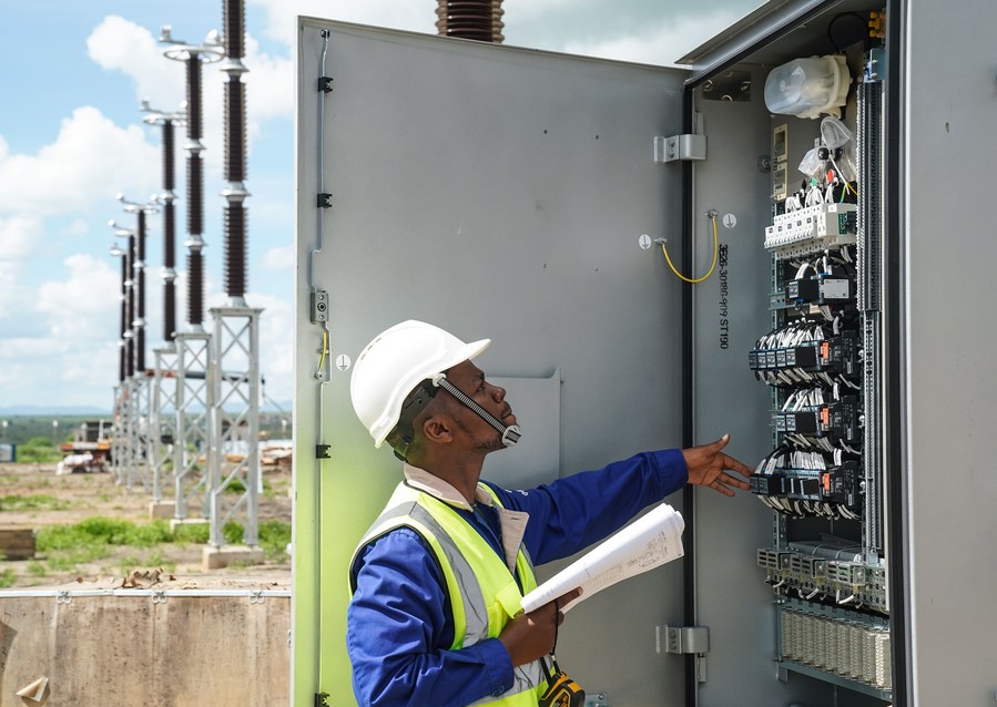 David Maina Kamore checks the operating status of devices at the construction site of Konza transformer substation in Machakos County, Kenya, May 5, 2023. (Xinhua/Han Xu)