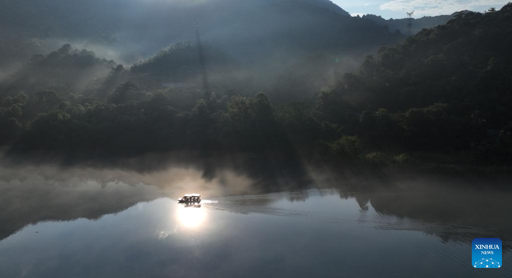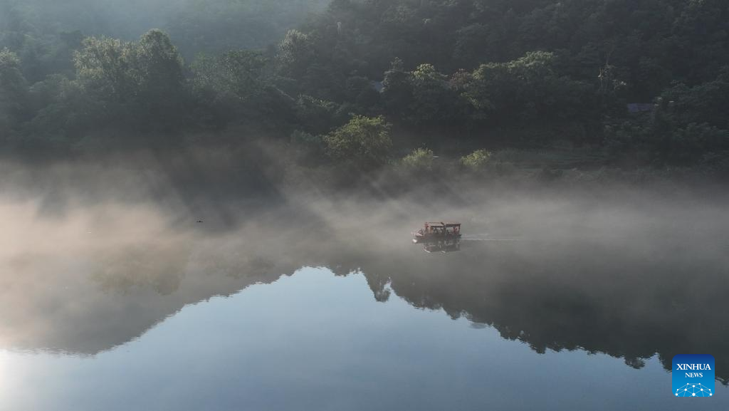 This aerial photo taken on July 26, 2023 shows people taking a boat at the Dongjiang Lake scenic spot in Zixing City, central China's Hunan Province. (Xinhua/Zhao Zhongzhi)