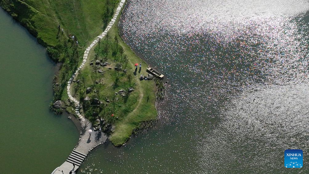 This aerial photo taken on July 28, 2023 shows people visiting the Yangtian lake grassland in Chenzhou City, central China's Hunan Province. (Xinhua/Zhao Zhongzhi)