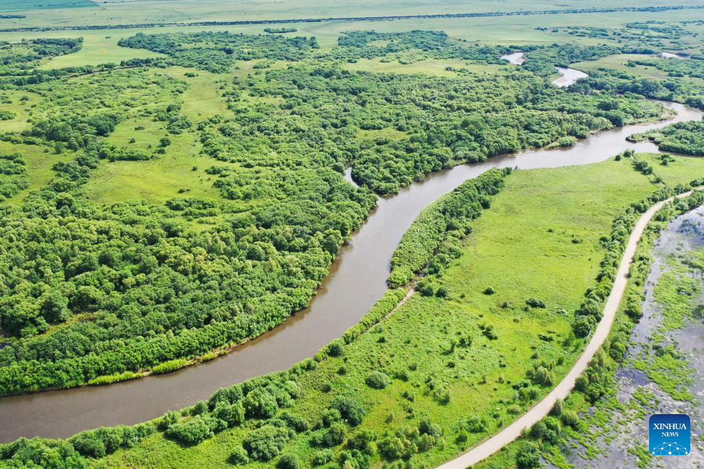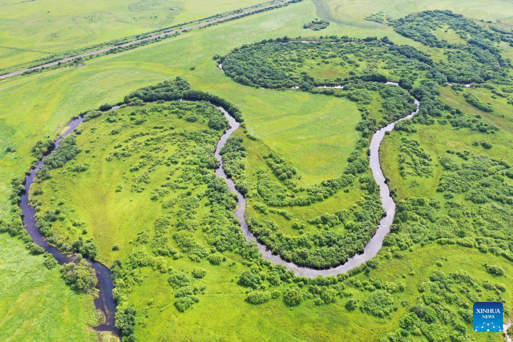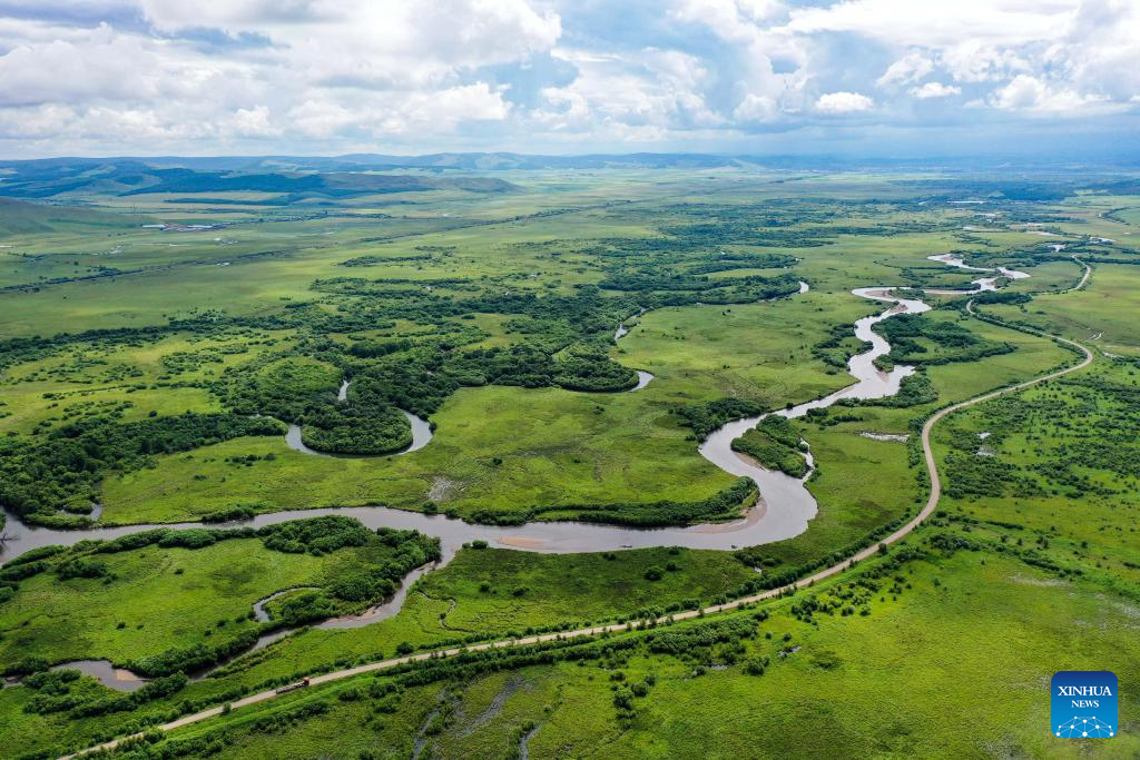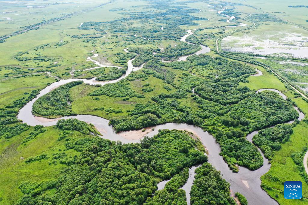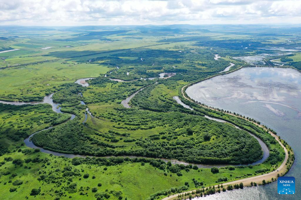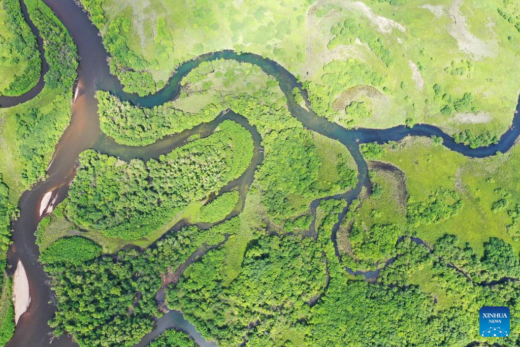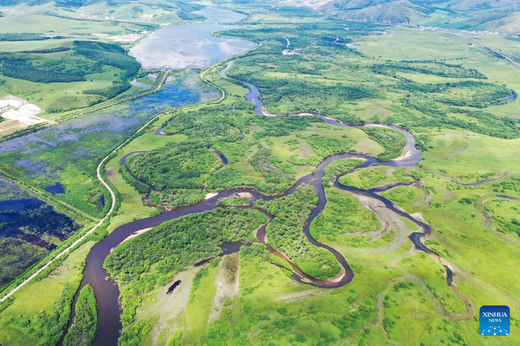 This aerial photo taken on July 29, 2023 shows the Mianduhe national wetland park in Hulun Buir, north China's Inner Mongolia Autonomous Region. (Xinhua/Li Zhipeng)