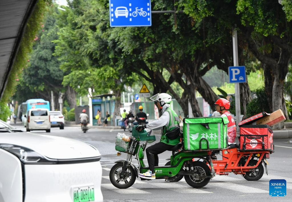 Deliverymen are seen on a street in Fuzhou, southeast China's Fujian Province, July 30, 2023. Fuzhou has seen its urban life gradually back to normal after typhoon Doksuri swept through the city. (Xinhua/Wei Peiquan)