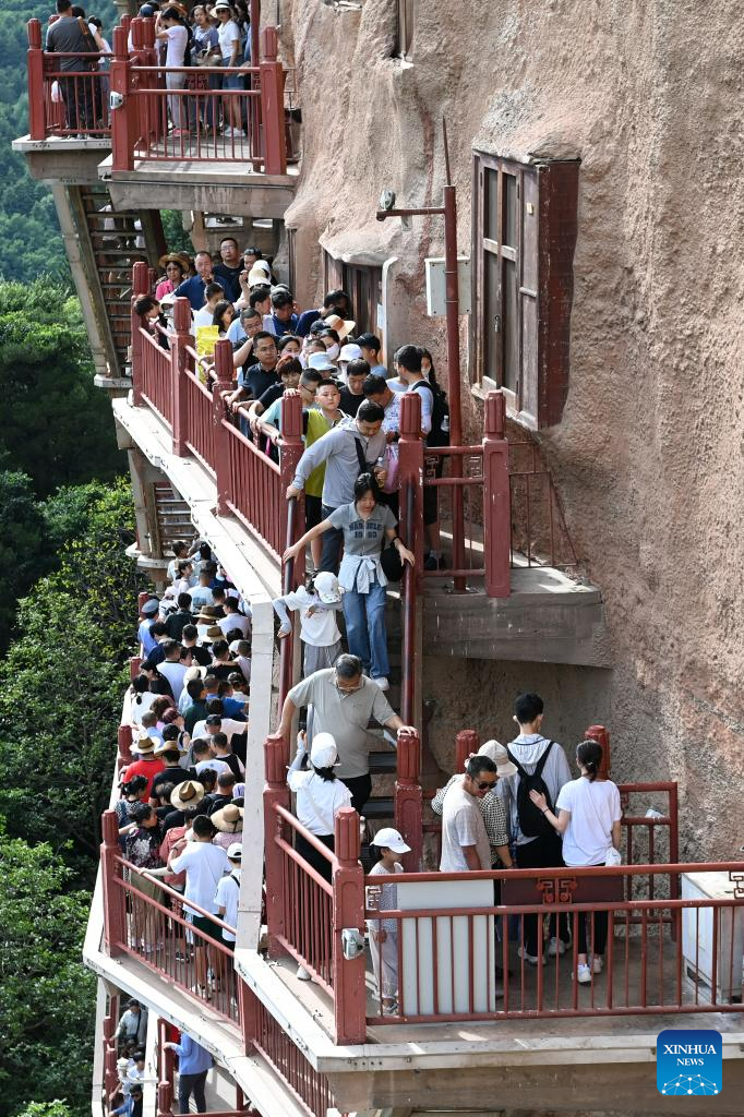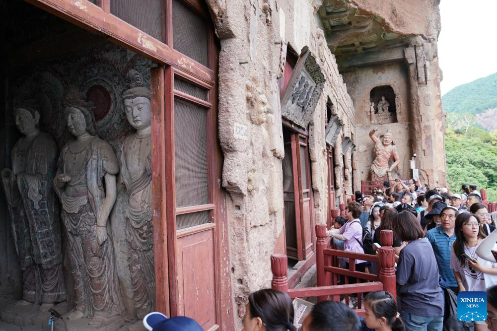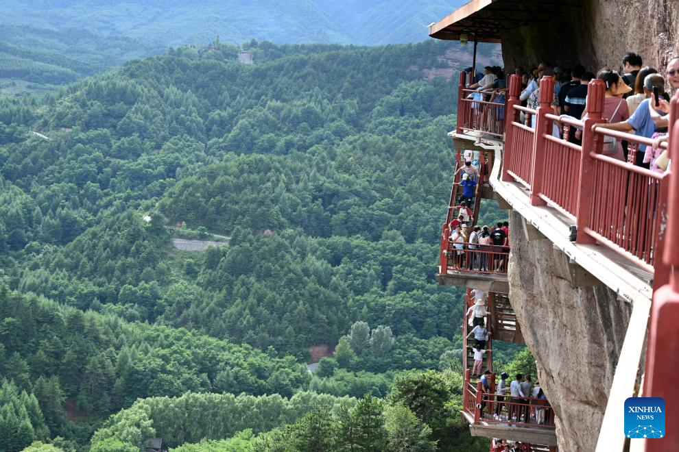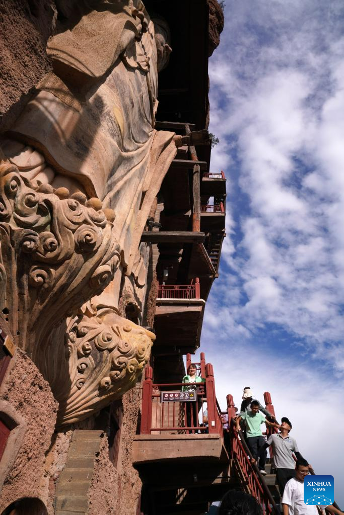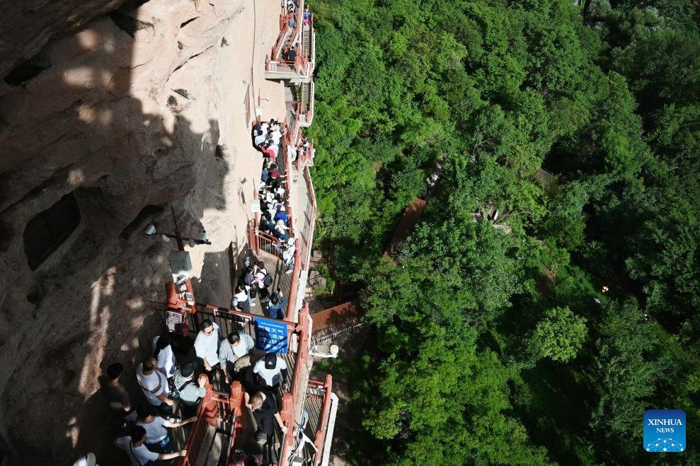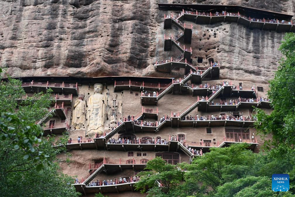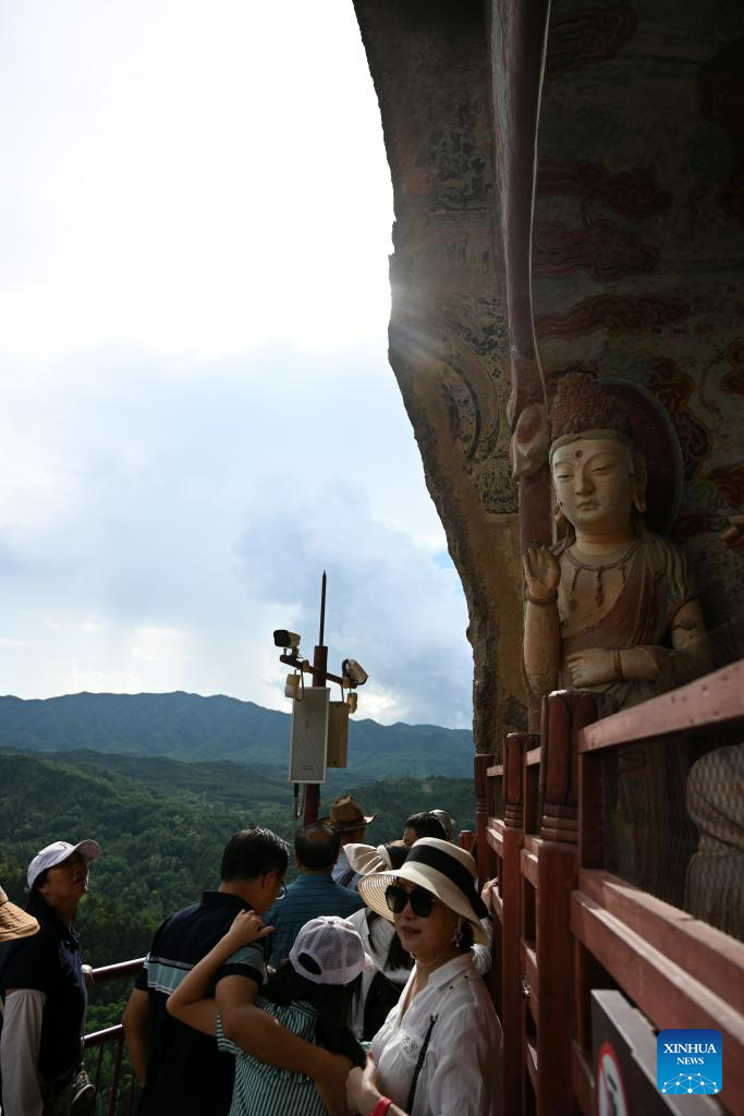 Tourists visit the Maijishan Grottoes in Tianshui City, northwest China's Gansu Province, July 30, 2023. The Maijishan grottoes, over 1,600 years old, are carved in the caves of an isolated mountain peak on the ancient Silk Road in the city of Tianshui. Two temporary sightseeing routes are provided to tourists between July 29 and Aug. 25 during the summer travel season. (Xinhua/Ma Ning)