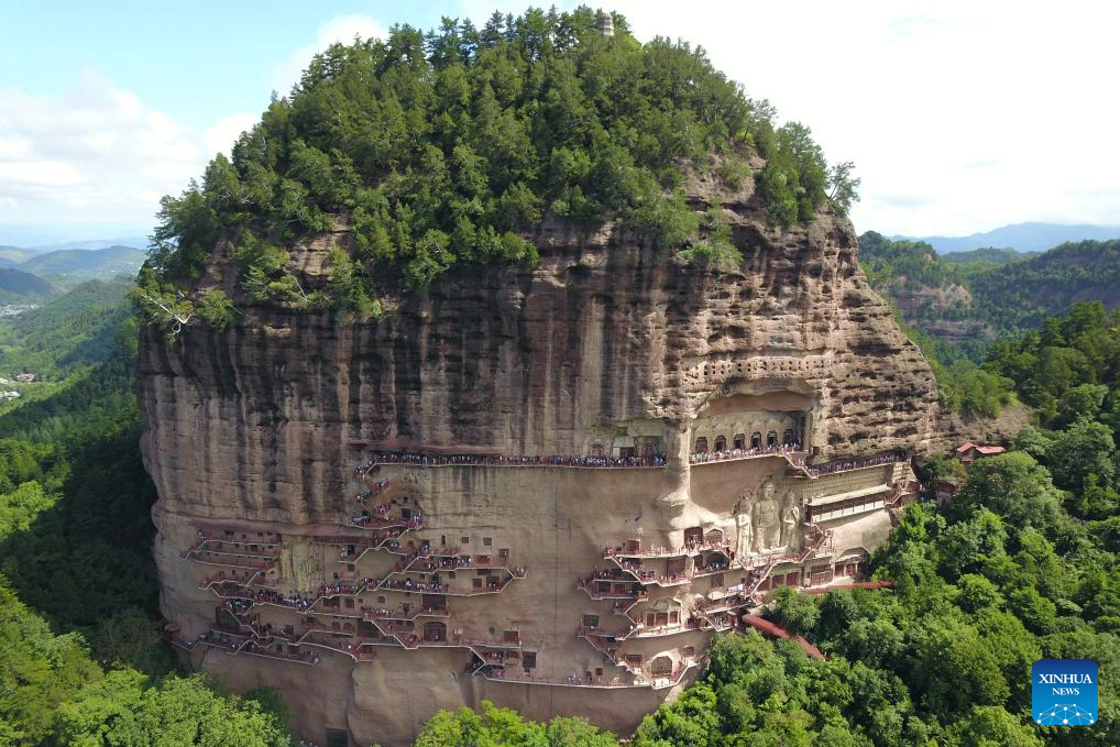 This aerial photo shows the Maijishan Grottoes in Tianshui City, northwest China's Gansu Province, July 29, 2023. The Maijishan grottoes, over 1,600 years old, are carved in the caves of an isolated mountain peak on the ancient Silk Road in the city of Tianshui. Two temporary sightseeing routes are provided to tourists between July 29 and Aug. 25 during the summer travel season. (Xinhua/Fan Peishen)