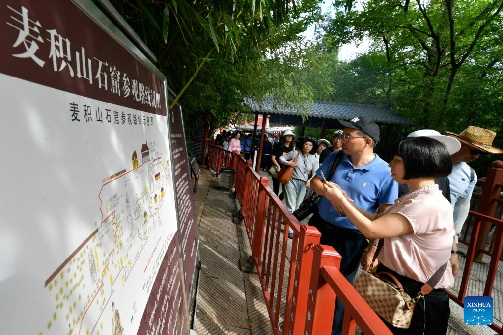 Tourists view a tour route diagram at the Maijishan Grottoes in Tianshui City, northwest China's Gansu Province, July 30, 2023. The Maijishan grottoes, over 1,600 years old, are carved in the caves of an isolated mountain peak on the ancient Silk Road in the city of Tianshui. Two temporary sightseeing routes are provided to tourists between July 29 and Aug. 25 during the summer travel season. (Xinhua/Fan Peishen)