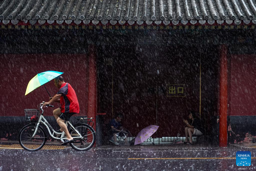 A man rides a bike amid the rain in Beijing, capital of China, July 30, 2023. [Photo/Xinhua]
