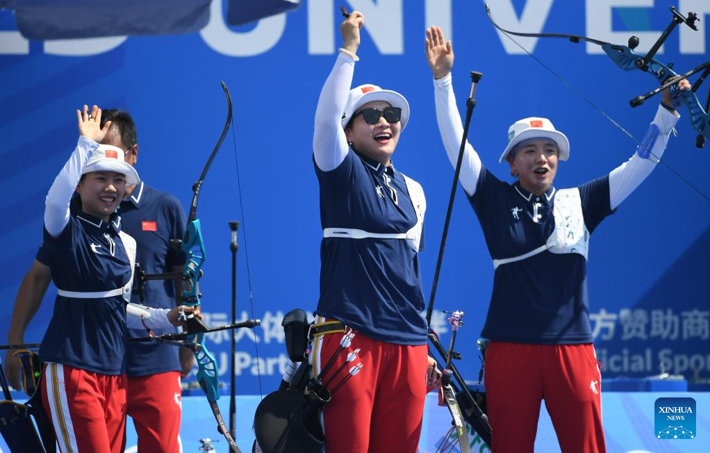 Team China celebrate after the Archery Recurve Women's Team Gold Medal Match between South Korea and China at the 31st FISU Summer World University Games in Chengdu, southwest China's Sichuan Province, July 30, 2023. (Xinhua/Deng Hua)