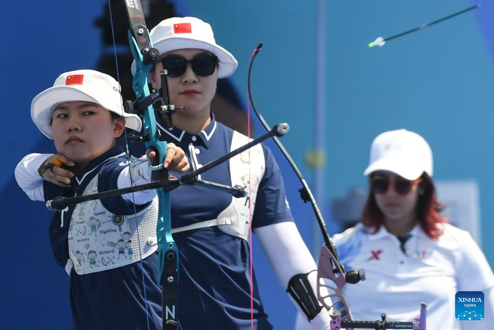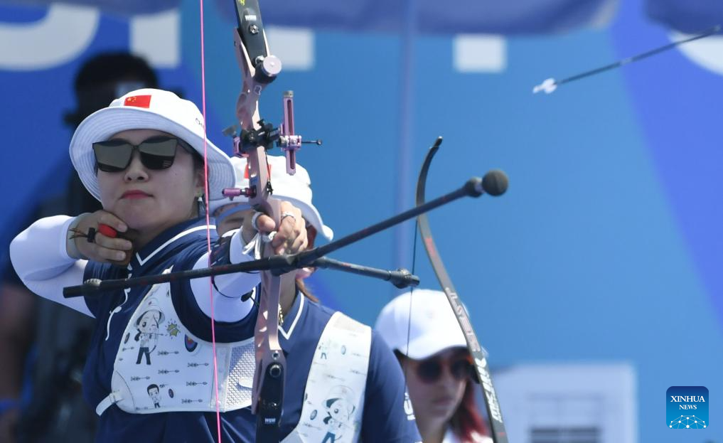 Wang Limin of China competes during the Archery Recurve Women's Team Gold Medal Match between South Korea and China at the 31st FISU Summer World University Games in Chengdu, southwest China's Sichuan Province, July 30, 2023. (Xinhua/Deng Hua)