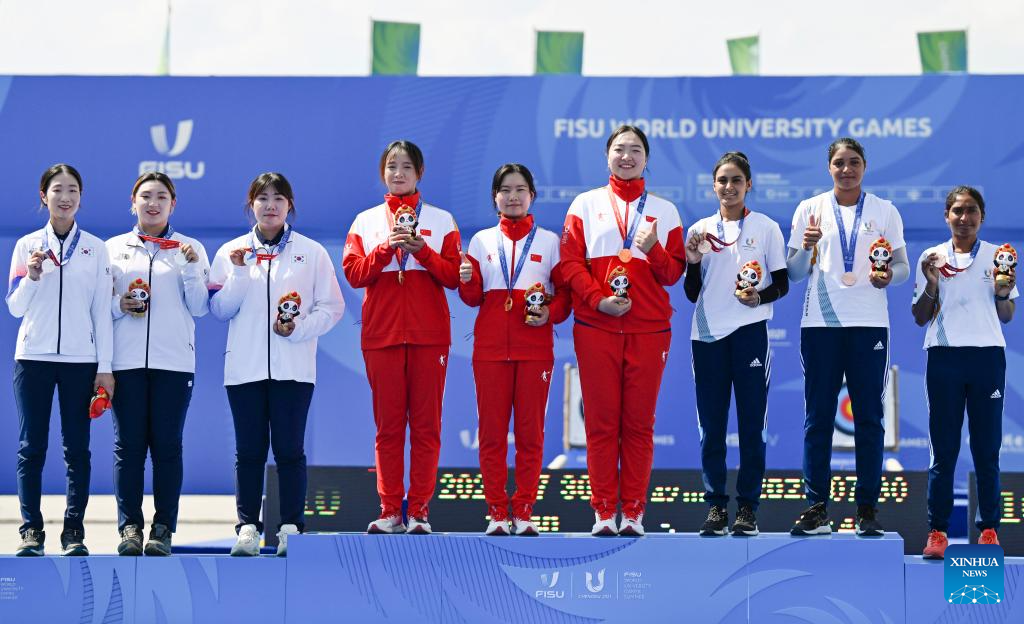Gold medalists Team China (C), silver medalists Team South Korea (L) and bronze medalists Team India pose during the awarding ceremony for the Archery Recurve Women's Team at the 31st FISU Summer World University Games in Chengdu, southwest China's Sichuan Province, July 30, 2023. (Xinhua/Deng Hua)
