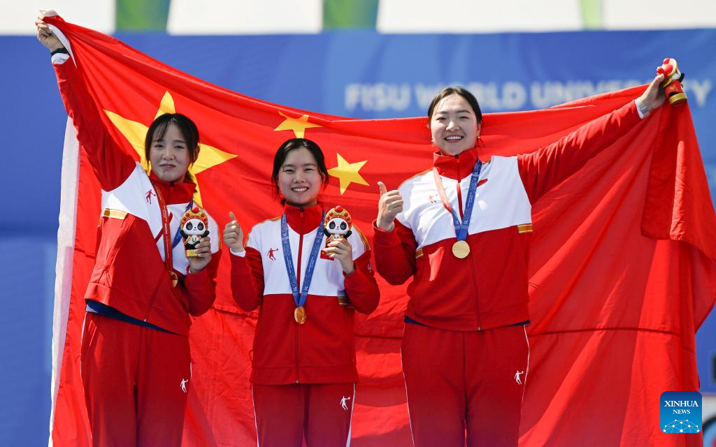 Team China celebrate during the awarding ceremony for the Archery Recurve Women's Team at the 31st FISU Summer World University Games in Chengdu, southwest China's Sichuan Province, July 30, 2023. (Xinhua/Deng Hua)