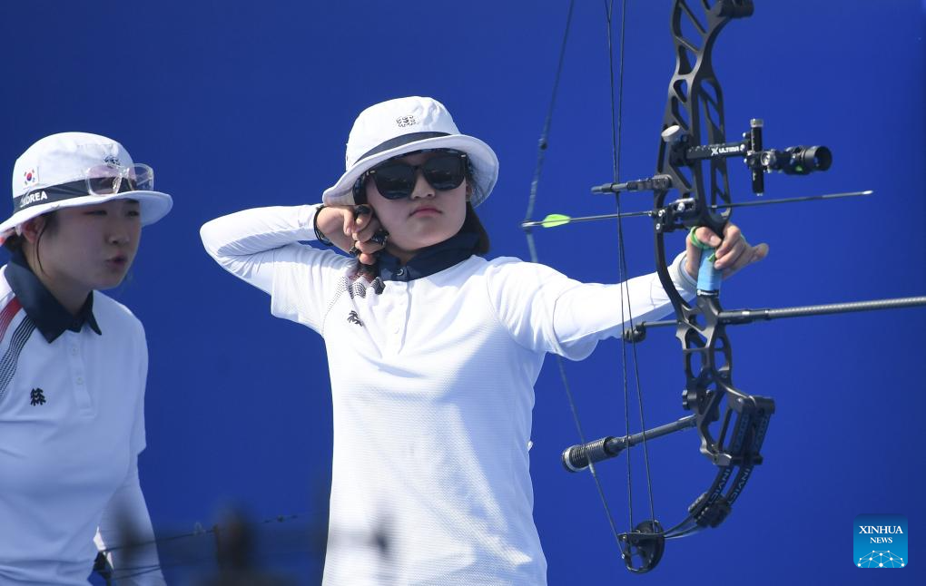 Cho Sua of South Korea competes during the Archery Compound Women's Team Gold Medal Match between South Korea and India at the 31st FISU Summer World University Games in Chengdu, southwest China's Sichuan Province, July 30, 2023. (Xinhua/Deng Hua)