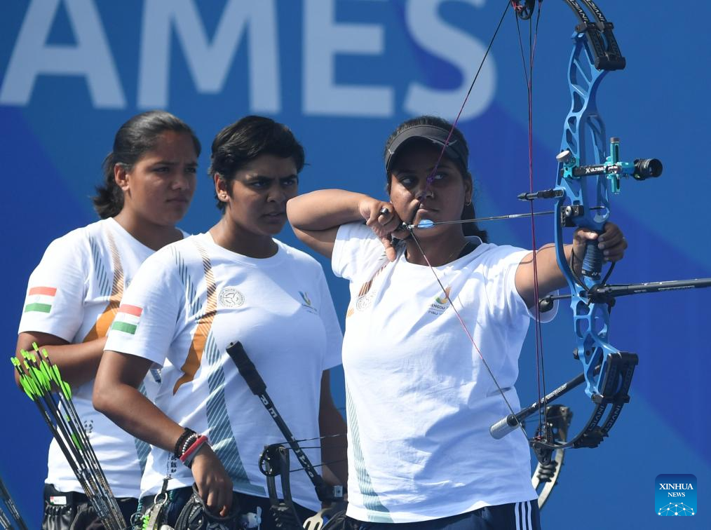 Purvasha sudhir Shende (R) of India competes during the Archery Compound Women's Team Gold Medal Match between South Korea and India at the 31st FISU Summer World University Games in Chengdu, southwest China's Sichuan Province, July 30, 2023. (Xinhua/Deng Hua)