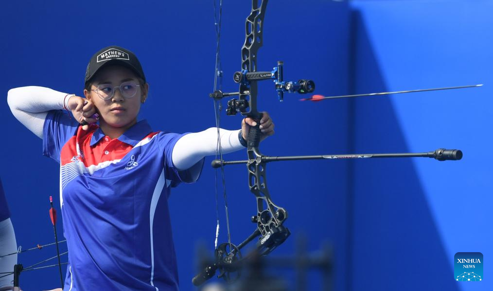 Lo Yi-hsuan of Chinese Taipei competes during the Archery Compound Women's Team Bronze Medal Match between China and Chinese Taipei at the 31st FISU Summer World University Games in Chengdu, southwest China's Sichuan Province, July 30, 2023. (Xinhua/Deng Hua)