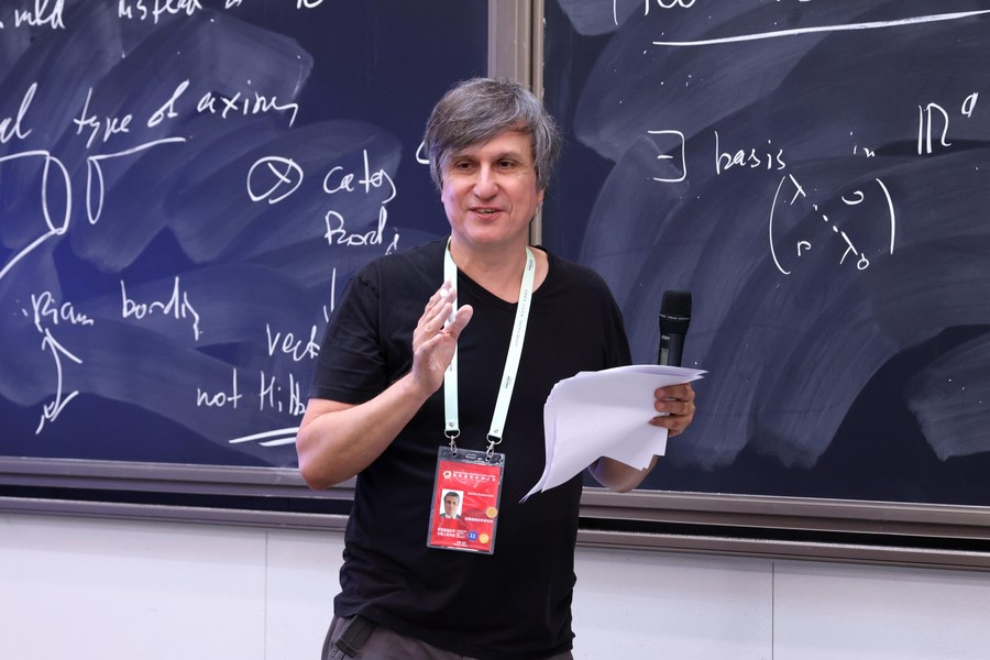 Maxim Kontsevich gives a lecture at Yanqi Lake Beijing Institute of Mathematical Sciences and Applications in Beijing, capital of China, July 19, 2023. (Tsinghua University/Handout via Xinhua)