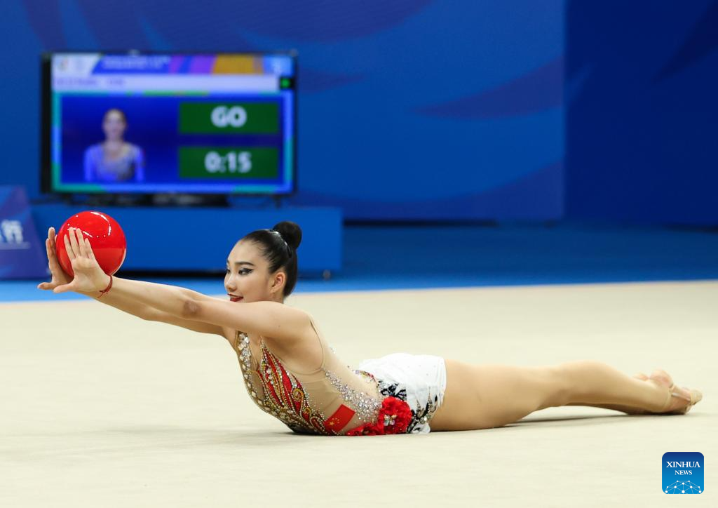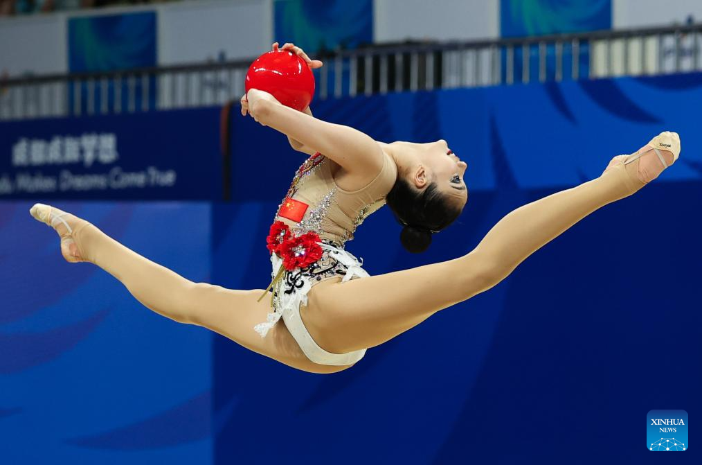 Li Huilin of China competes during the Rhythmic Gymnastics Individual Ball Final at the 31st FISU Summer World University Games in Chengdu, southwest China's Sichuan Province, July 31, 2023. (Xinhua/Wang Jingqiang)