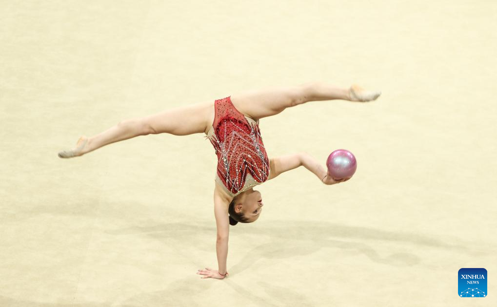 Volozhanina Tatyana Nikolaevna of Bulgaria competes during the Rhythmic Gymnastics Individual Ball Final at the 31st FISU Summer World University Games in Chengdu, southwest China's Sichuan Province, July 31, 2023. (Xinhua/Zhang Liyun)