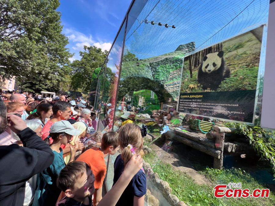Visitors celebrate birthdays for giant pandas Ding Ding and Ru Yi at the Moscow Zoo in Russia, July 30, 2023. (Photo: China News Service/Tian Bing)