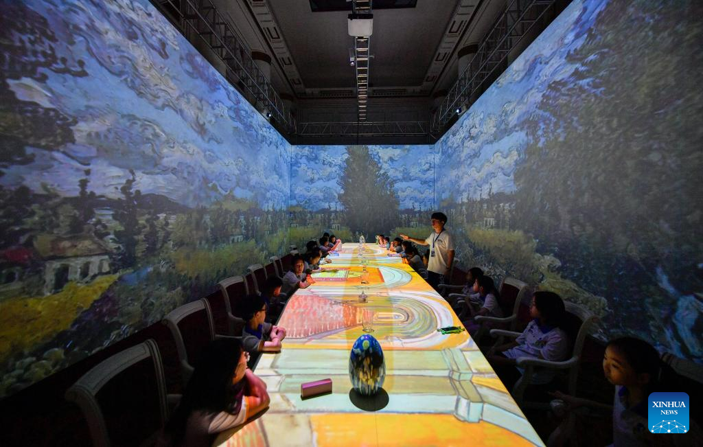 Students watch an immersive show of an artwork at the Tianjin Digital Art Museum in Tianjin, north China, July 30, 2023. During the summer vacation, the National Maritime Museum of China and the Tianjin Digital Art Museum jointly offered students with a study camp themed on ocean and art. Altogether 22 students from Beijing, Tianjin and Hebei Province learnt knowledge of ocean and nature and got in touch with digital art during the camp. (Xinhua/Sun Fanyue)