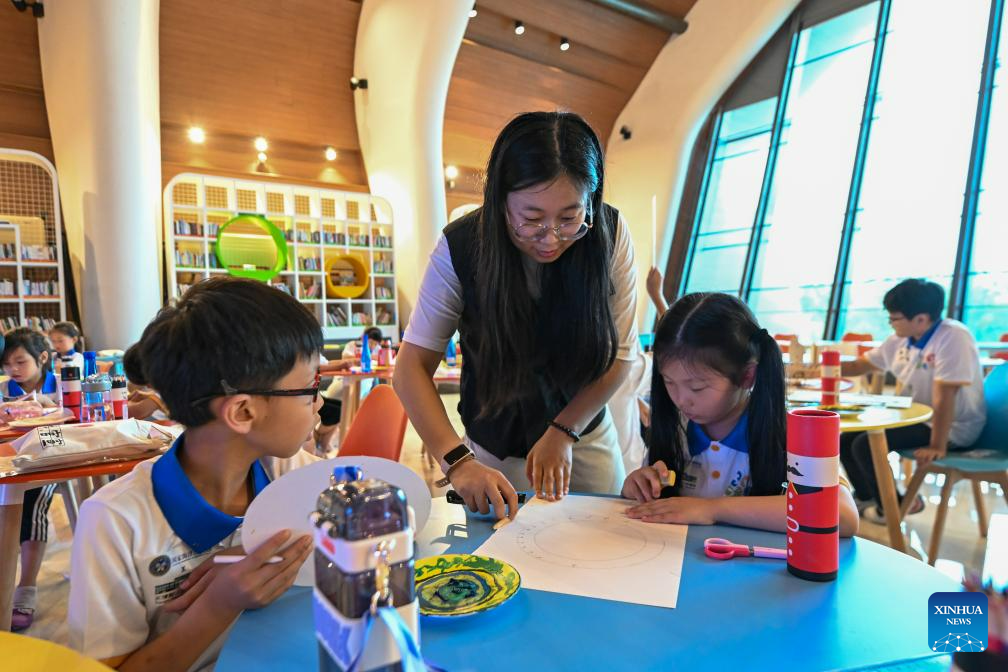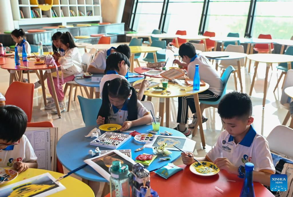 Students experience painting on porcelains at the National Maritime Museum of China in Tianjin, north China, July 29, 2023. During the summer vacation, the National Maritime Museum of China and the Tianjin Digital Art Museum jointly offered students with a study camp themed on ocean and art. Altogether 22 students from Beijing, Tianjin and Hebei Province learnt knowledge of ocean and nature and got in touch with digital art during the camp. (Xinhua/Sun Fanyue)