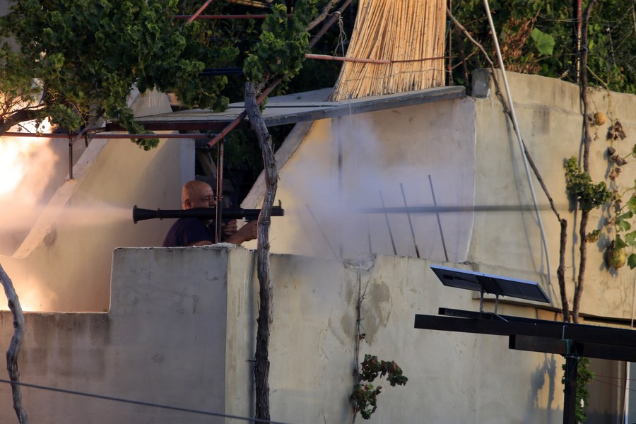 A Fatah fighter fires at a center of Islamic militants in Ain Al-Helweh camp for Palestinian refugees during the clashes between Fatah movement and Islamist militants near Sidon, south Lebanon, on July 30, 2023. (Photo by Ali Hashisho/Xinhua)