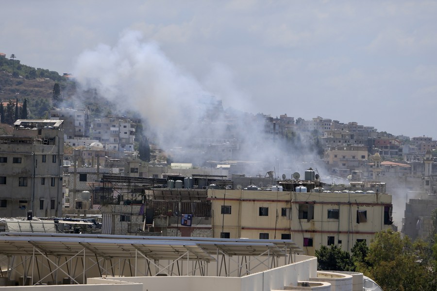 Smoke from rocket shells rises above the Ain Al-Helweh camp for Palestinian refugees during clashes between Fatah movement and Islamist militants near Sidon, south Lebanon on July 30, 2023. (Photo by Ali Hashisho/Xinhua)