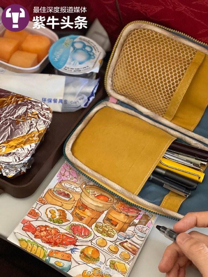 A young illustrator who calls himself "Ruoguan Nianhua" online draws cartoons on a plane. (Photo/yangtse.com)