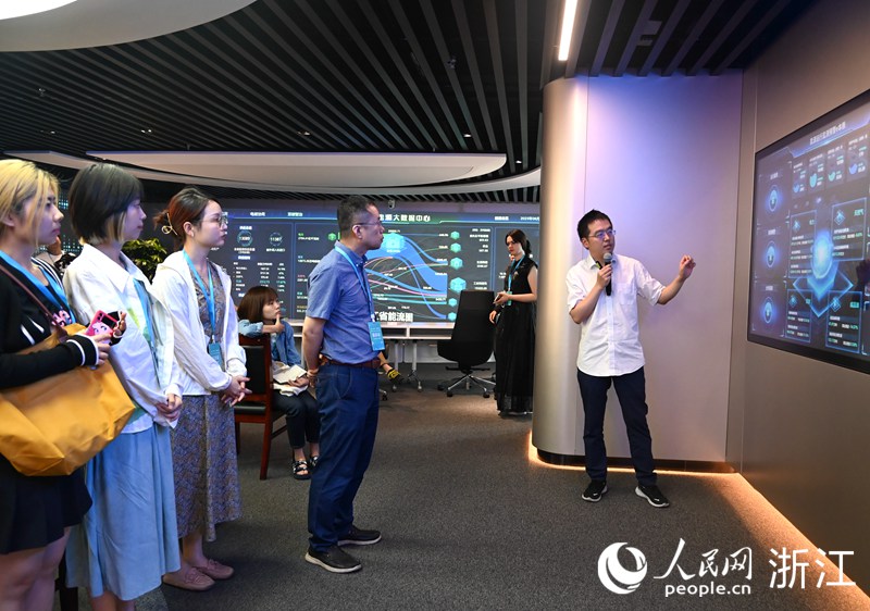 The "Hello, Carbon Neutrality" research group listen to a briefing about the "Hangzhou Dual Carbon Digital Intelligent Platform" at Hangzhou Energy Big Data Evaluation and Application Research Center. (People's Daily Online/Fang Pengyimeng)