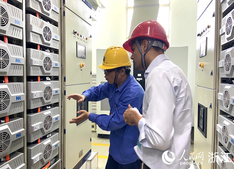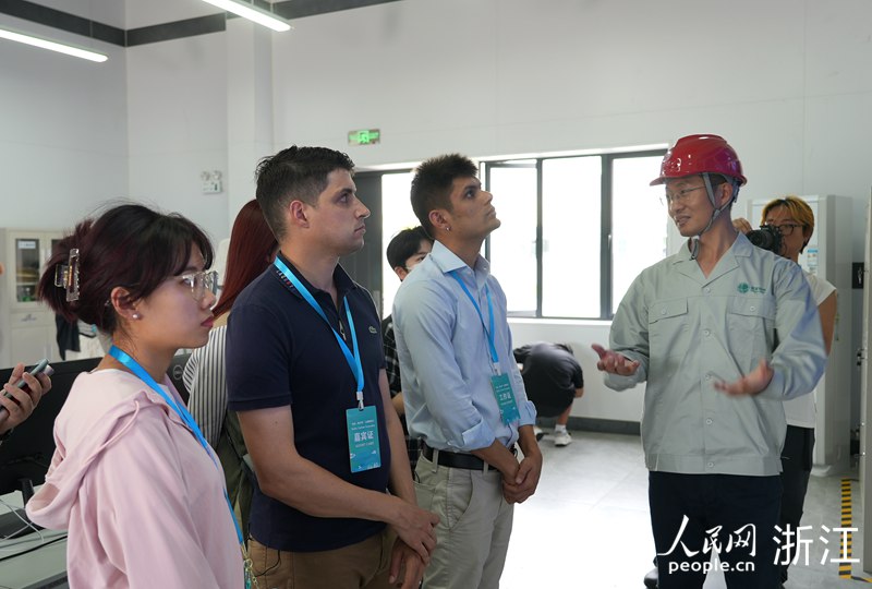 An employee at Xiaoshan Power Plant talks to a group member. (People's Daily Online/Fang Pengyimeng)