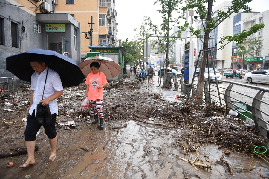 People walk on a muddy street in the flood-hit Mentougou District of Beijing, the capital of China, on July 31, 2023. By 4 p.m. Monday, the Chinese capital had seen 40 hours of continuous rainfall. (Xinhua/Ju Huanzong)