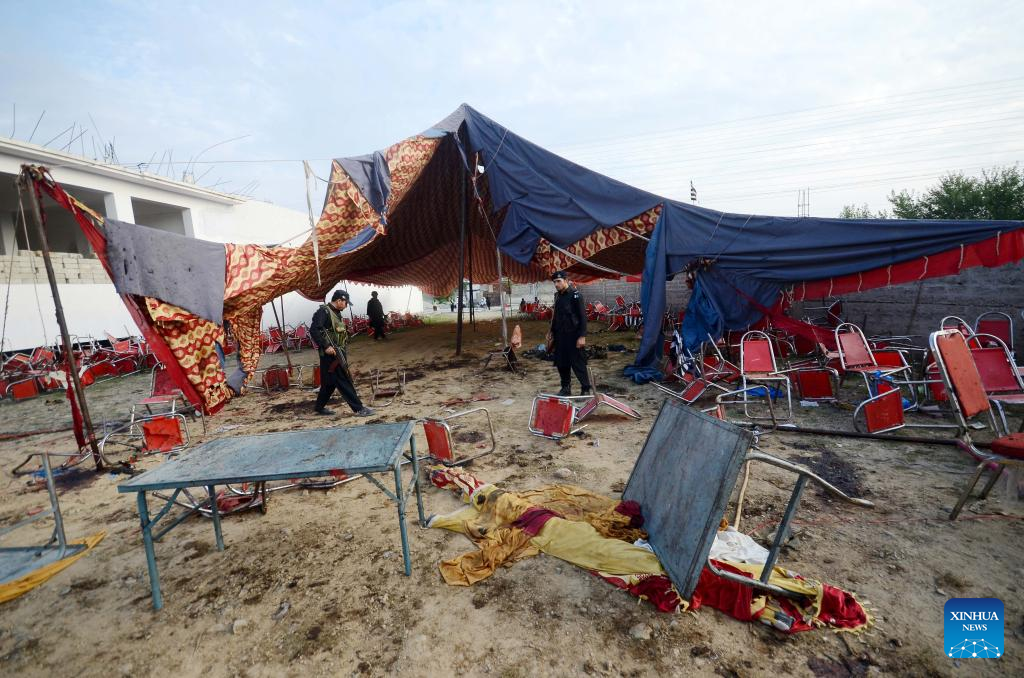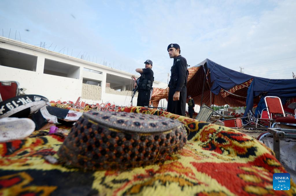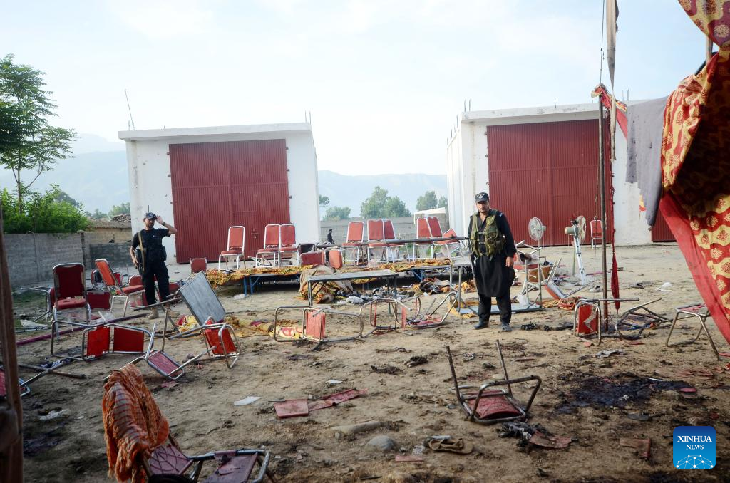 A security member stands guard at the site of a suicide attack in Bajaur district, Khyber Pakhtunkhwa province, northwestern Pakistan, on July 31, 2023. (Str/Xinhua)