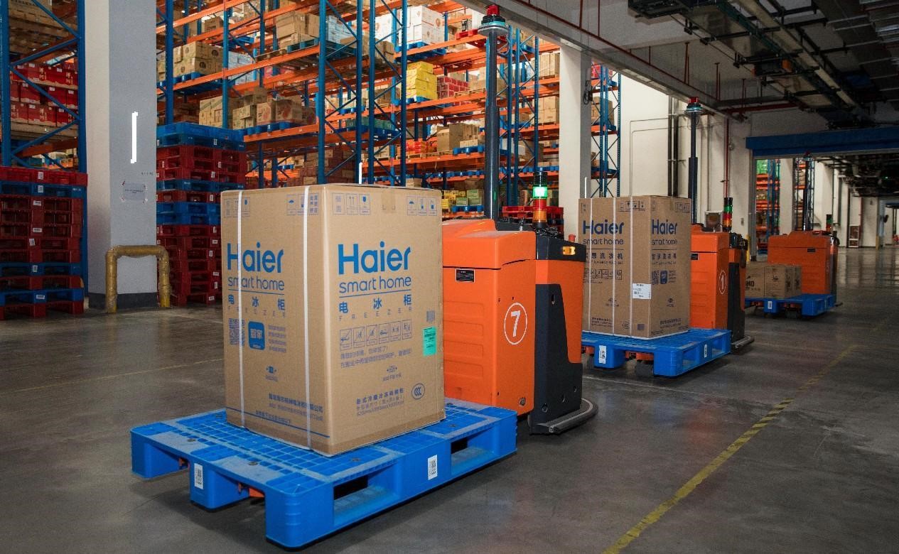 Refrigerators are moved by automated guided vehicles in an unattended warehouse in Huai'an, east China's Jiangsu province. (People's Daily Online/Ji Xingming)