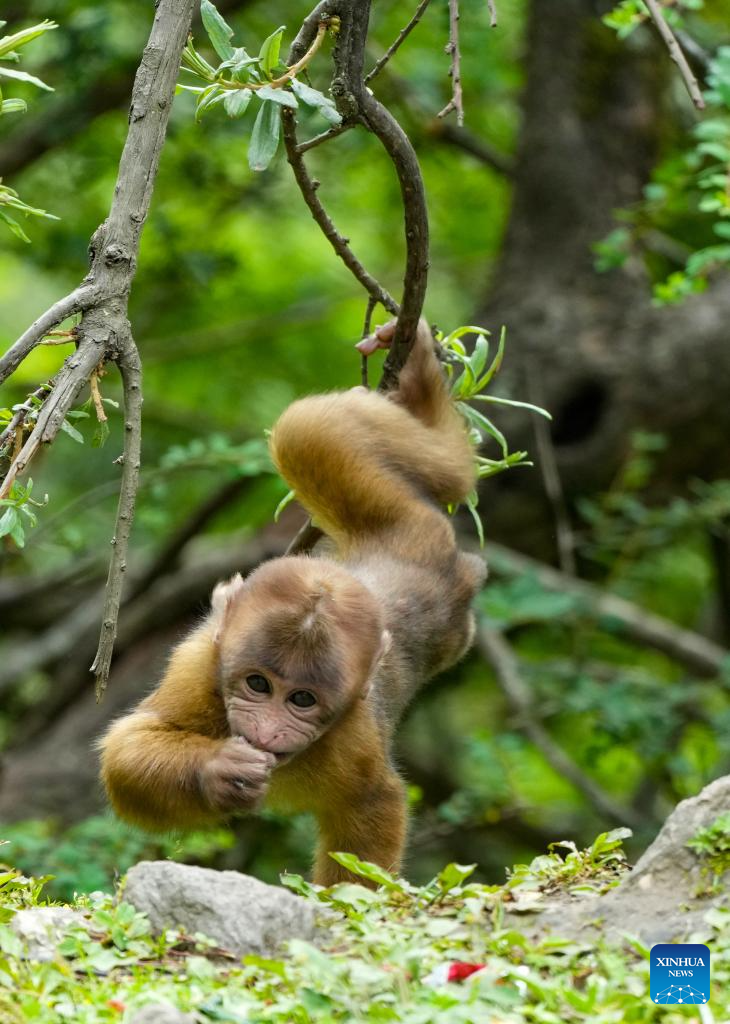 This photo taken on July 29, 2023 shows macaques in a valley of Cona County, Shannan City, southwest China's Tibet Autonomous Region. (Xinhua/Jiang Fan)