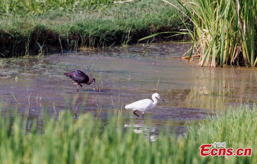 A glossy ibis and an egret forage in the Shuanggui Lake national wetland park in Liangping district of Chongqing. (Photo: China News Service/Yu Xianhuai)