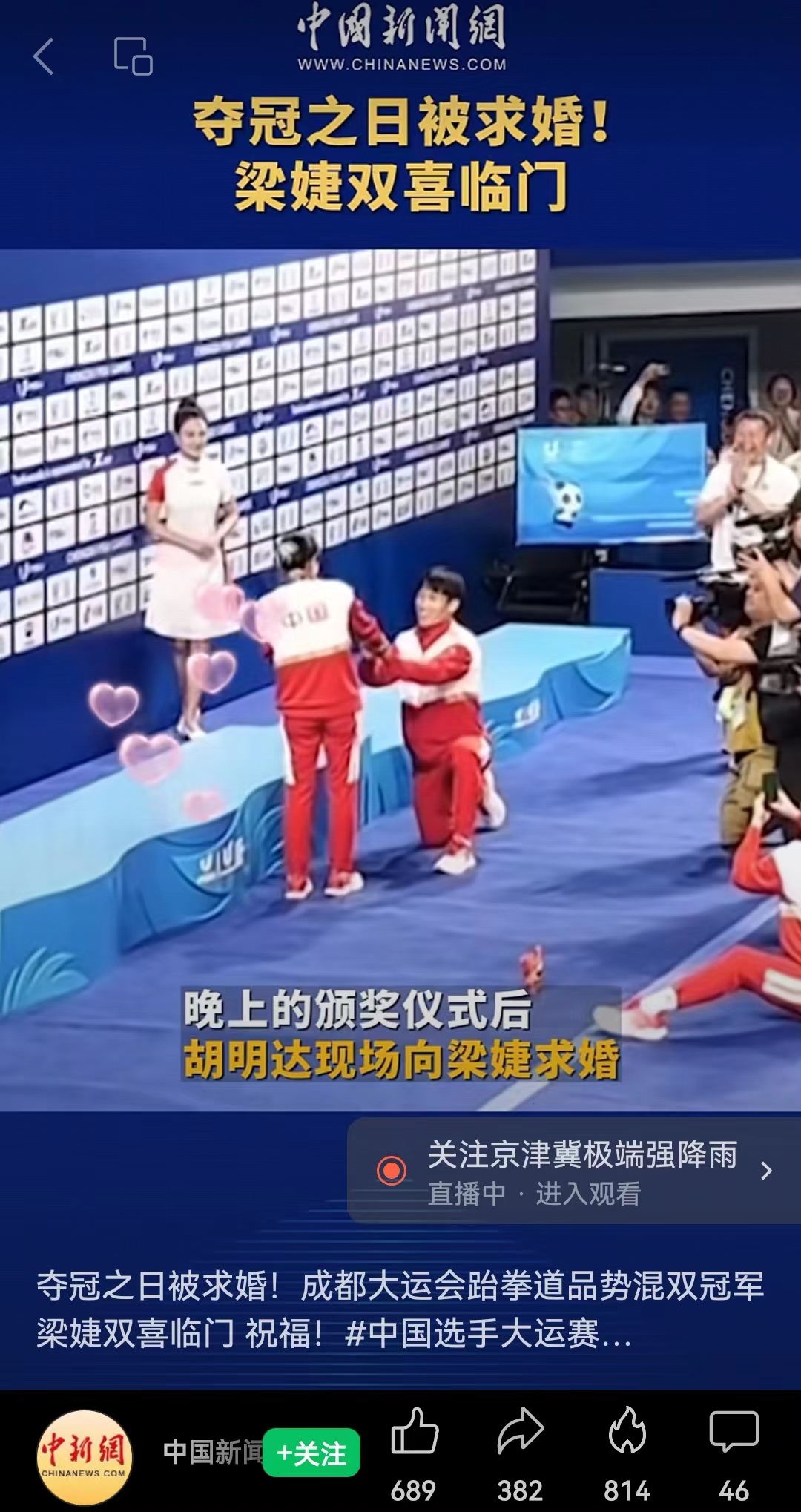 A video capture from chinanews.com shows Hu Mingda proposes to Liang Jie after Liang won the taekwondo mixed pair poomsae gold during the Chengdu FISU University Games on Sunday.