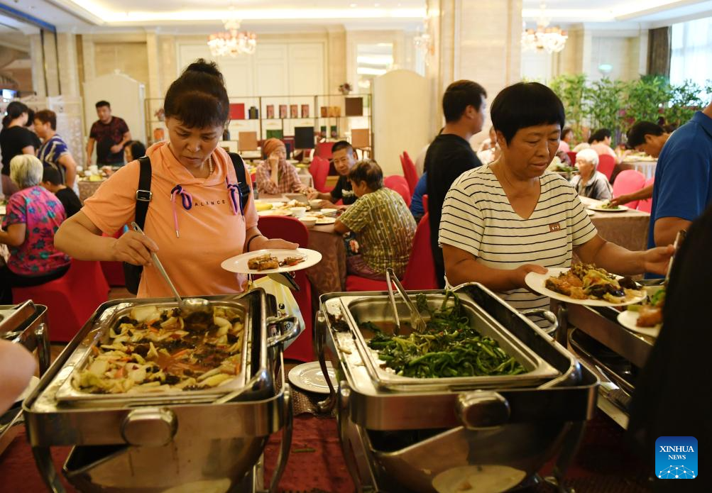 Villagers of Qinglonghu Town have meal at a temporary shelter after being evacuated from flood-hit areas in Fangshan District, Beijing, capital of China, Aug. 1, 2023. Several districts in the city, including the hardest-hit Fangshan and Mentougou, maintained the highest-level alert for flood control on Tuesday, as downpours will continue, the city's flood control authorities said. (Xinhua/Zhang Chenlin)