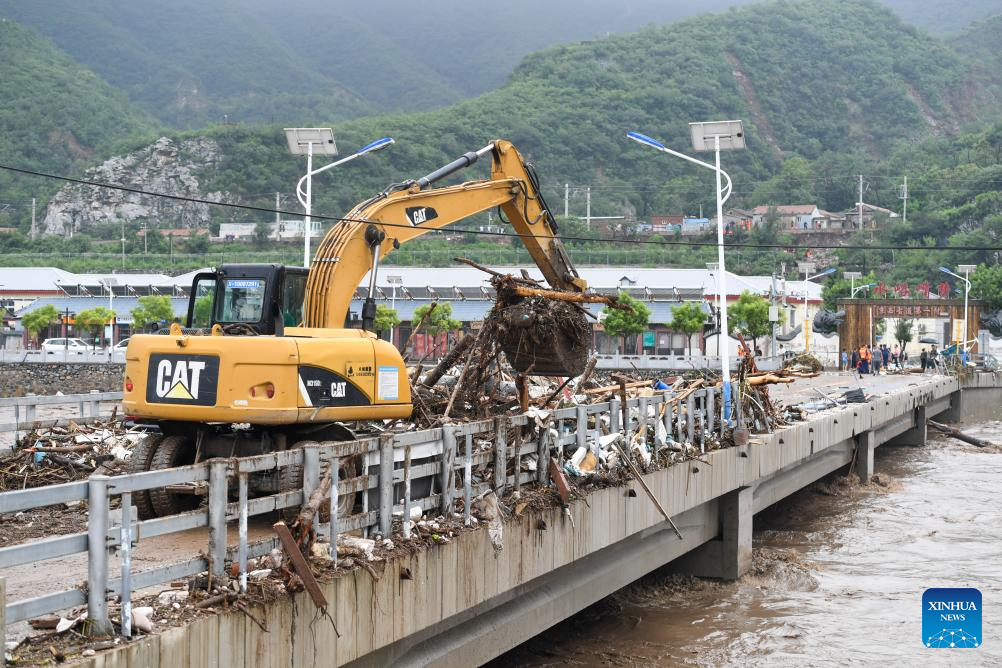 An excavator removes debris and litter from a bridge in Shuiyuzui Village in flood-hit Mentougou District, Beijing, capital of China, Aug. 1, 2023. Several districts in the city, including the hardest-hit Fangshan and Mentougou, maintained the highest-level alert for flood control on Tuesday, as downpours will continue, the city's flood control authorities said. (Xinhua/Ju Huanzong)