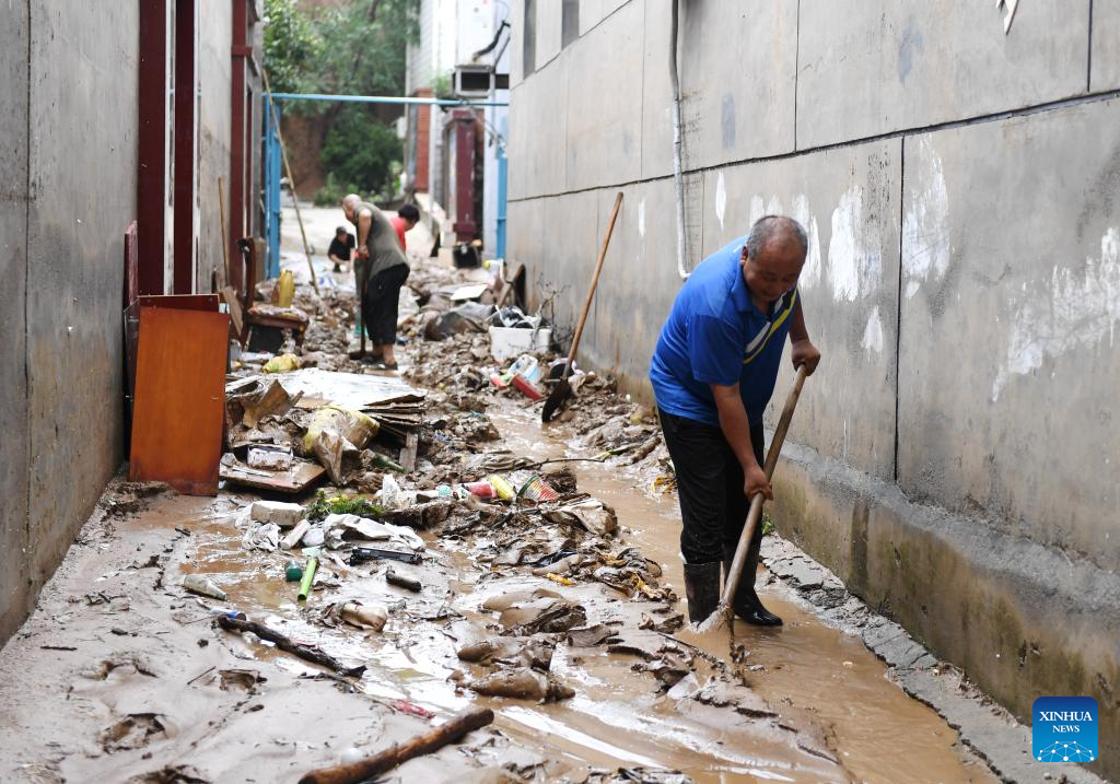 Villagers clean up silt deposited by a recent flood in Shangwan Village of Qinglonghu Town, Fangshan District, Beijing, capital of China, Aug. 1, 2023. Several districts in the city, including the hardest-hit Fangshan and Mentougou, maintained the highest-level alert for flood control on Tuesday, as downpours will continue, the city's flood control authorities said. (Xinhua/Zhang Chenlin)