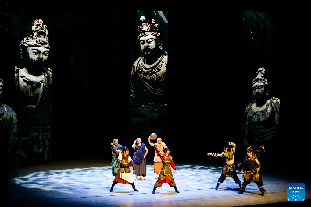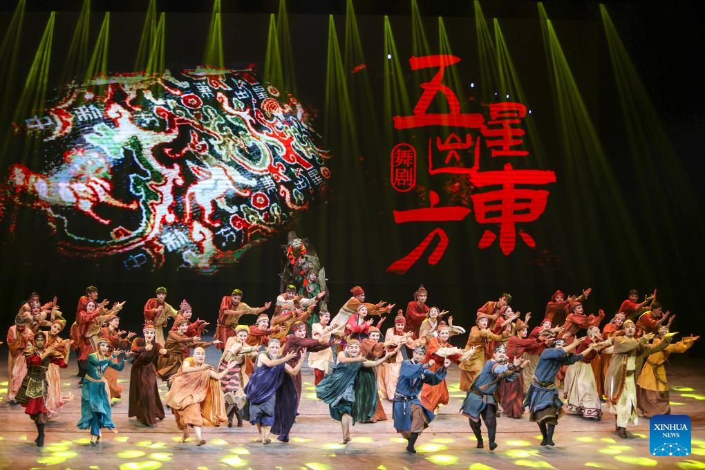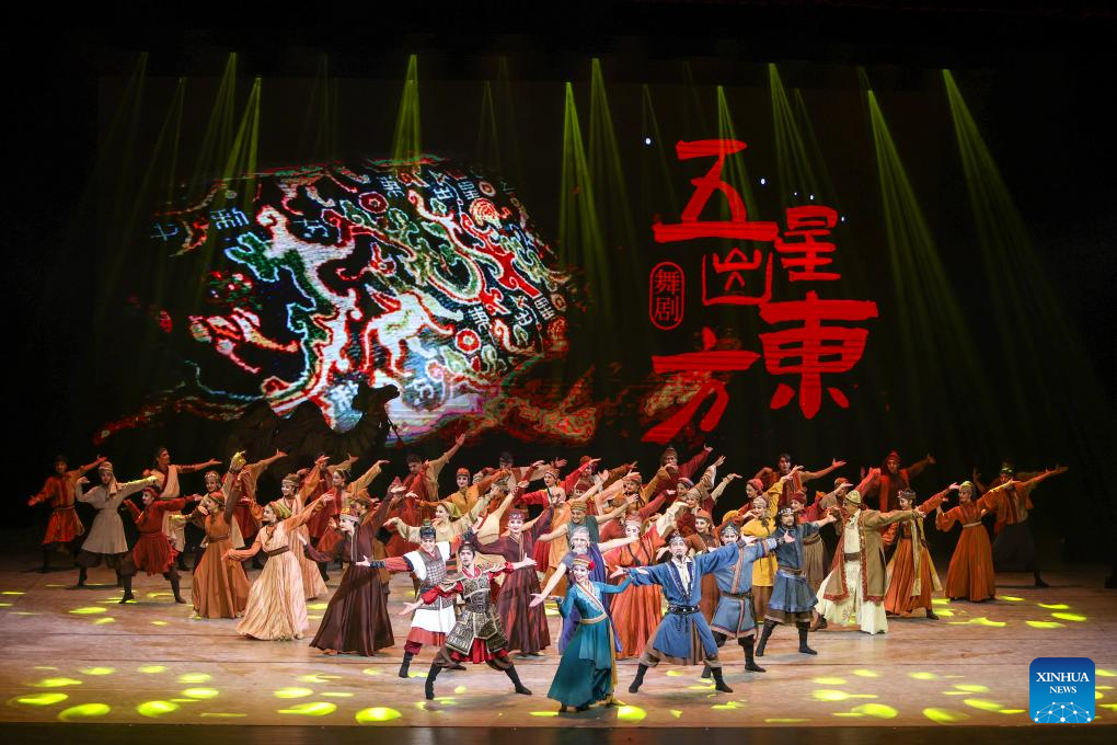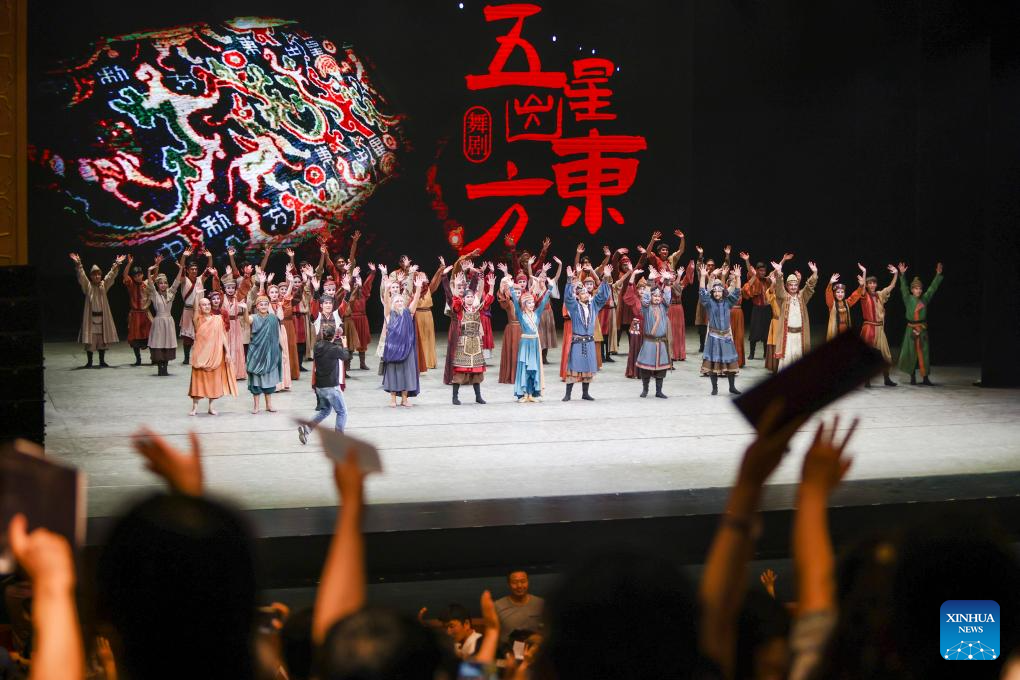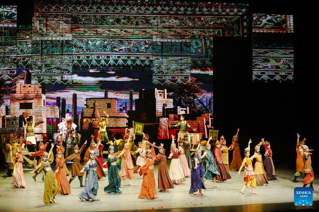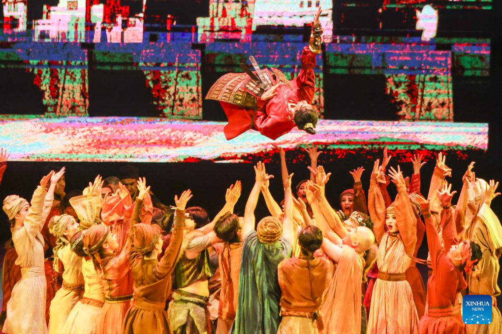 Dancers of a song and dance troupe from Hotan Prefecture perform a dance drama at a theater in Urumqi, northwest China's Xinjiang Uygur Autonomous Region, July 31, 2023. The dance drama was presented during the 6th China Xinjiang International Dance Festival. (Xinhua/Hao Zhao)