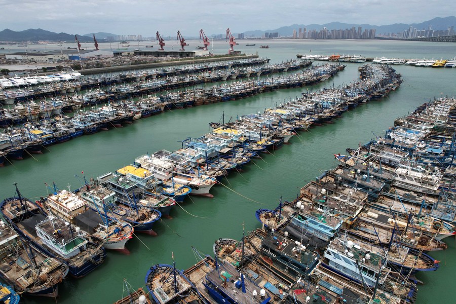 This aerial photo shows fishing boats at a dock in Xiamen, southeast China's Fujian Province, July 27, 2023. (Photo by Zeng Demeng/Xinhua)