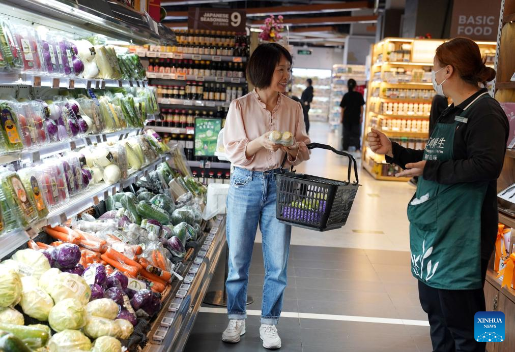 Zhu Chunnan buys vegetables for her employer's family at a supermarket in east China's Shanghai, July 28, 2023. (Xinhua/Liu Ying)