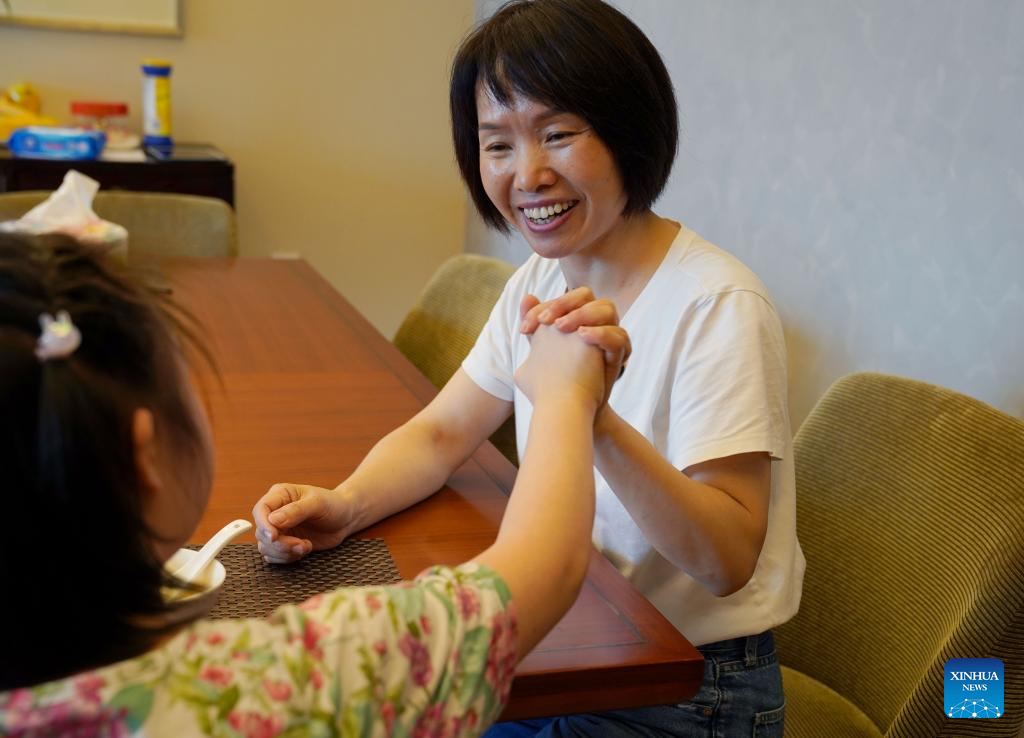 Zhu Chunnan talks with her employer's child in east China's Shanghai, July 29, 2023. (Xinhua/Liu Ying)