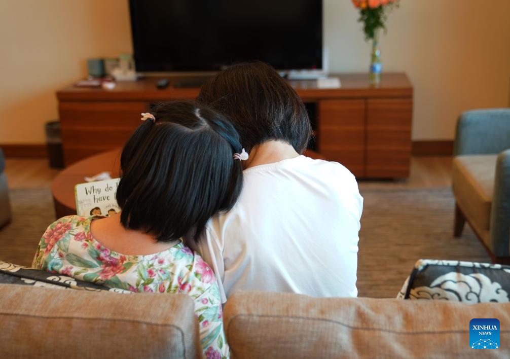 Zhu Chunnan reads a book with her employer's child in east China's Shanghai, July 29, 2023. (Xinhua/Liu Ying)
