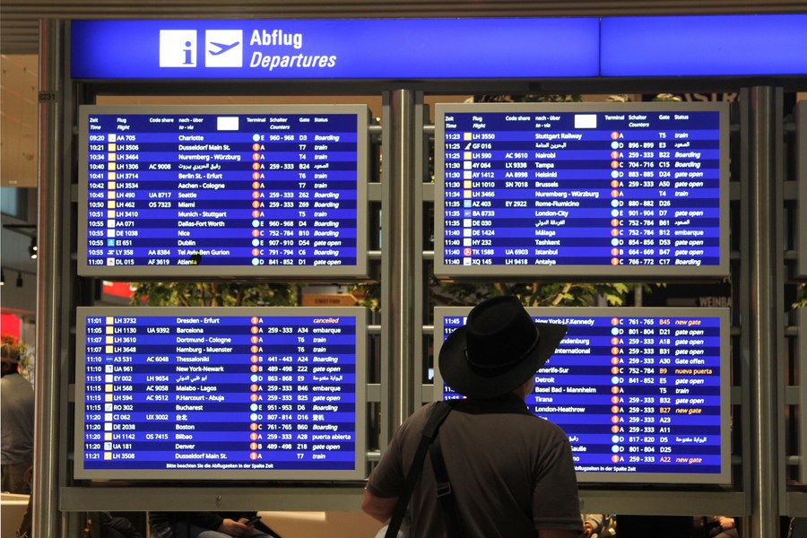 A man browses a bulletin of flight information at an international airport in Frankfurt, Germany, June 12, 2023. (Xinhua/Shan Weiyi)