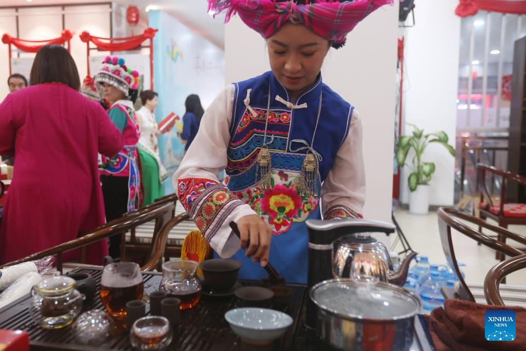 A staff member makes tea during the "Tea for Harmony: Yaji Cultural Salon" at the China Cultural Center in Yangon, Myanmar, Aug. 1, 2023. (Photo by Myo Kyaw Soe/Xinhua)