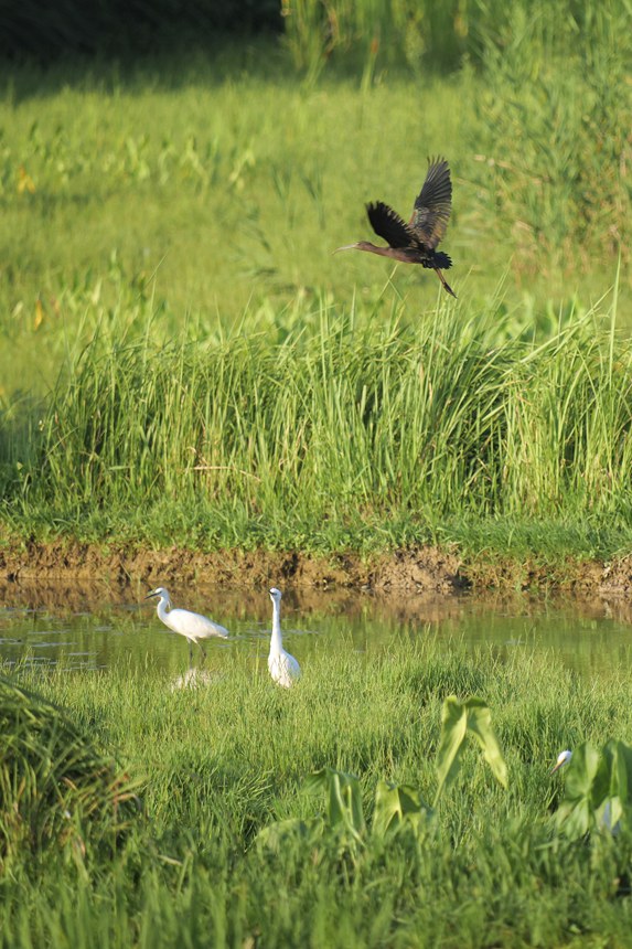 A glossy ibis and egrets are seen at a wetland in the Shuanggui Lake national wetland park in Liangping district of southwest China's Chongqing Municipality. (Photo/Yu Huaixian)